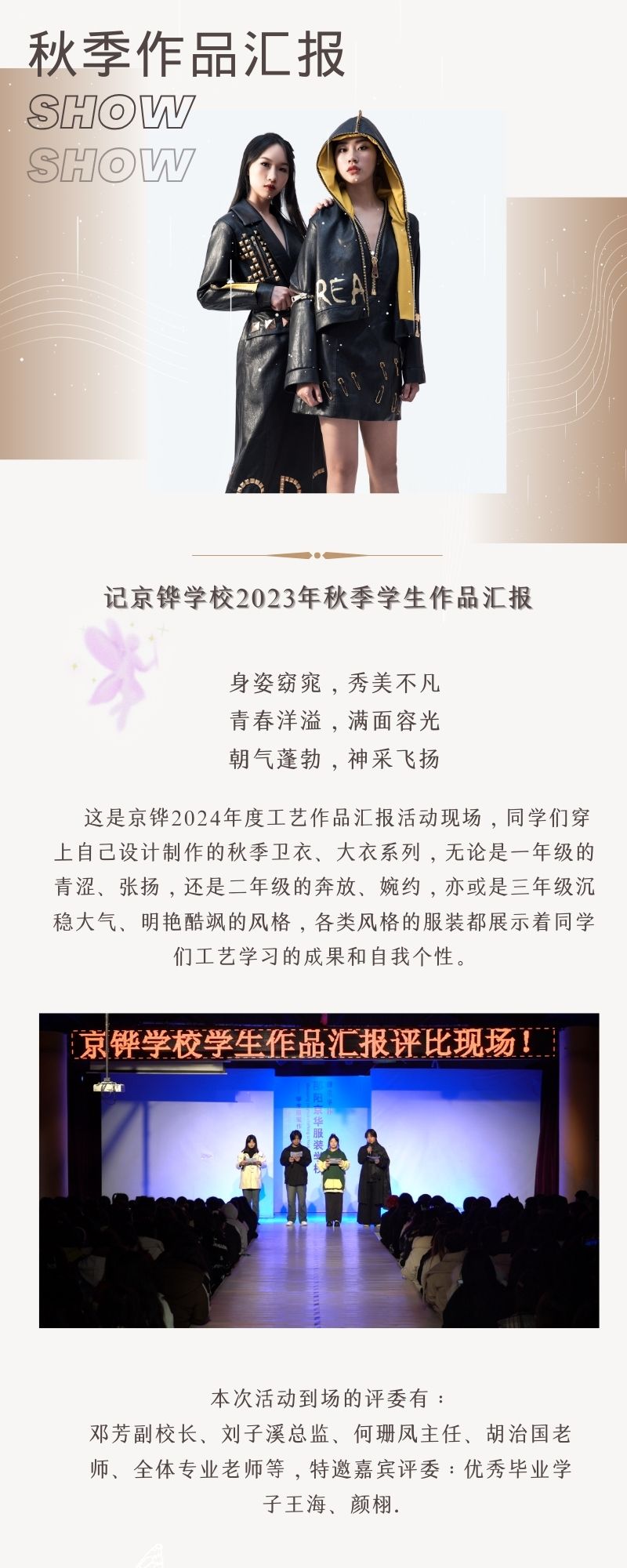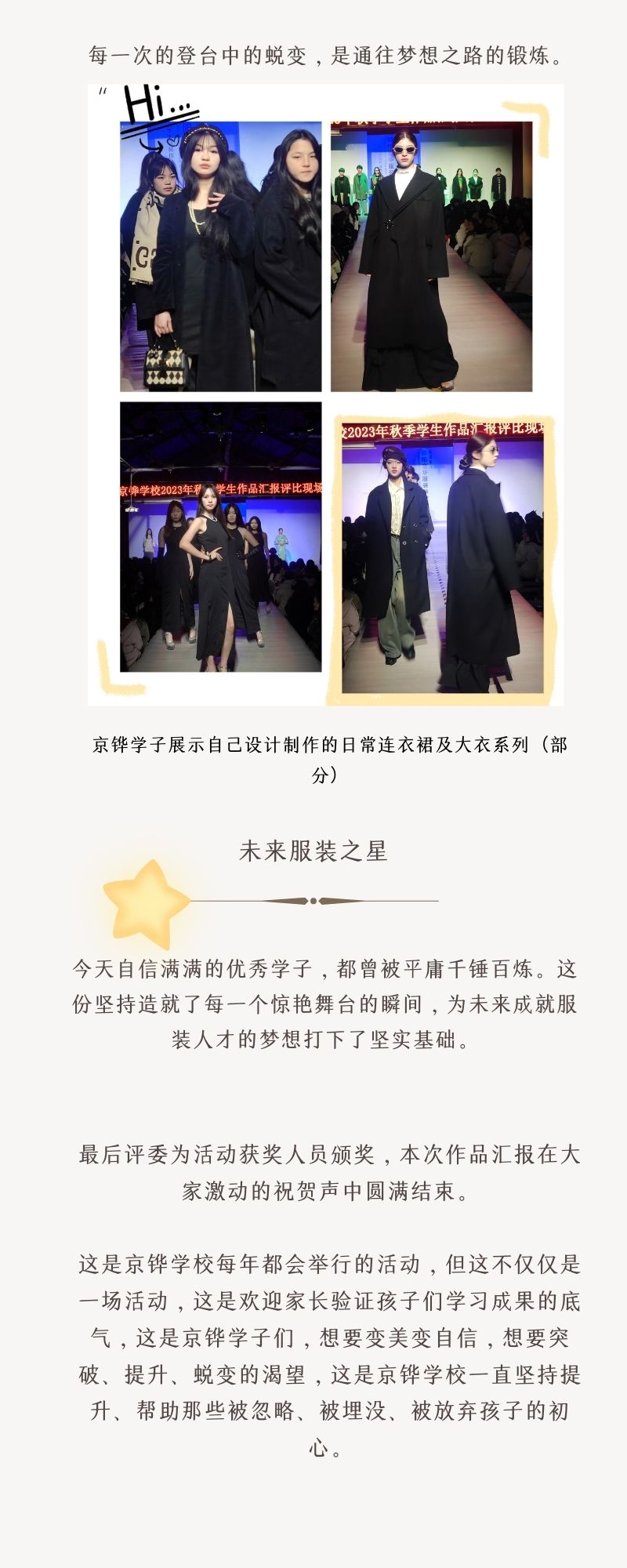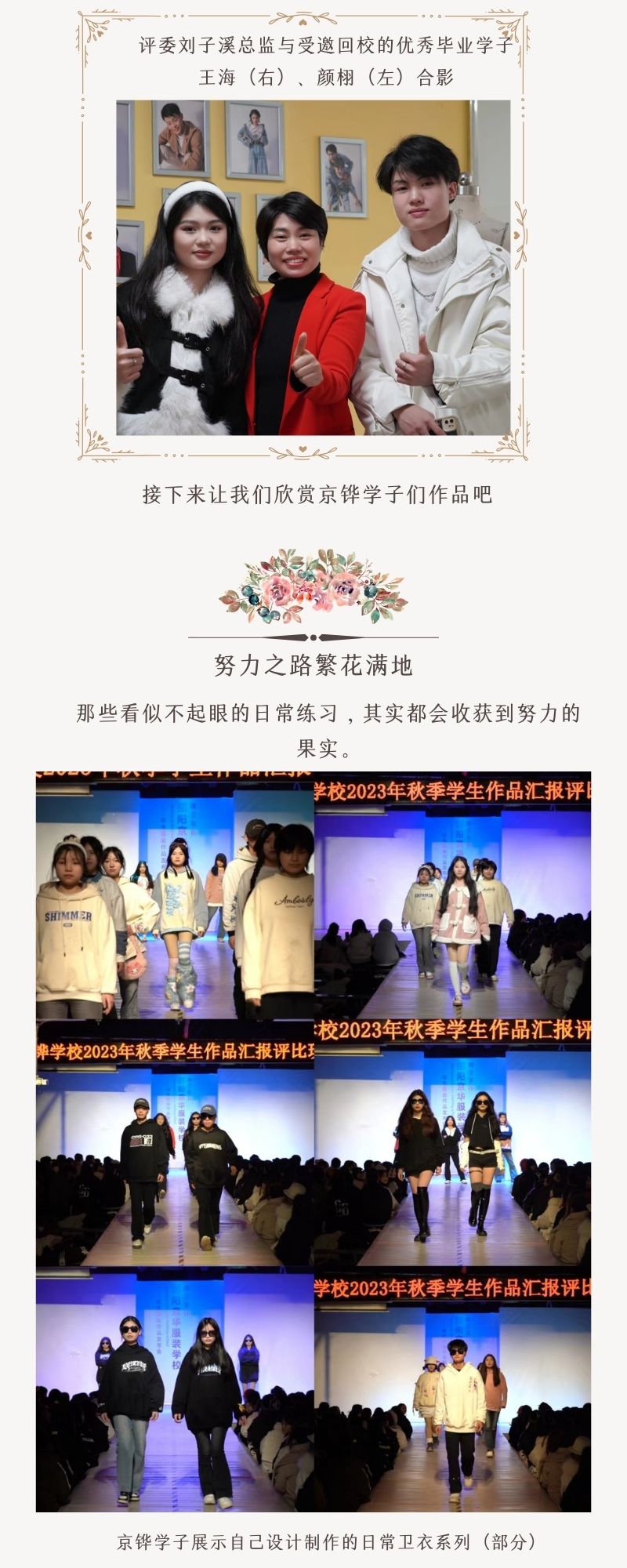 這是京鏵學校”2023年秋季學生作品匯報“活動現場,同學們穿上自己設計的衛衣和大衣,有奔放有婉約有青澀有張揚,各類服裝都展示著同學們的工藝學習成果和自我個性