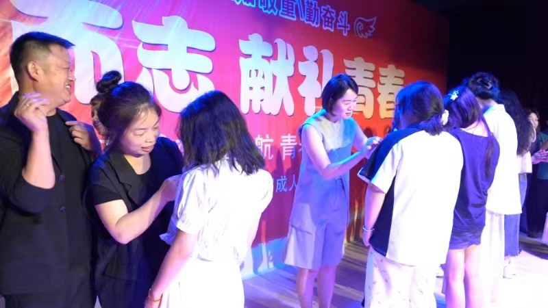 臺上,老師們為學生代表佩戴成人紀念章,送上美好的祝福。臺下,家長們為孩子送上成人禮物以及一封充滿愛意的書信。孩子和老師握手、鞠躬,表達感恩之情。家長則送上溫暖的擁抱與祝福,有的還為孩子送上了美麗的鮮花,并紛紛拿出手機拍照留念,記錄這美好的一刻,場面十分溫馨感人。