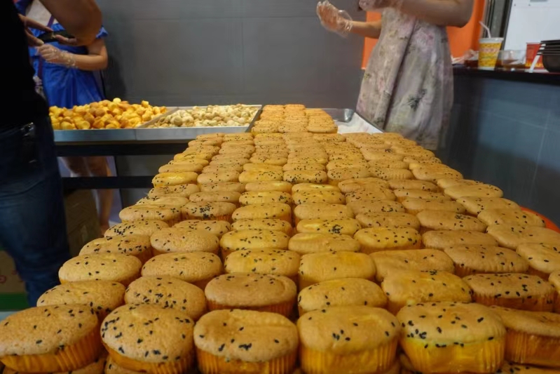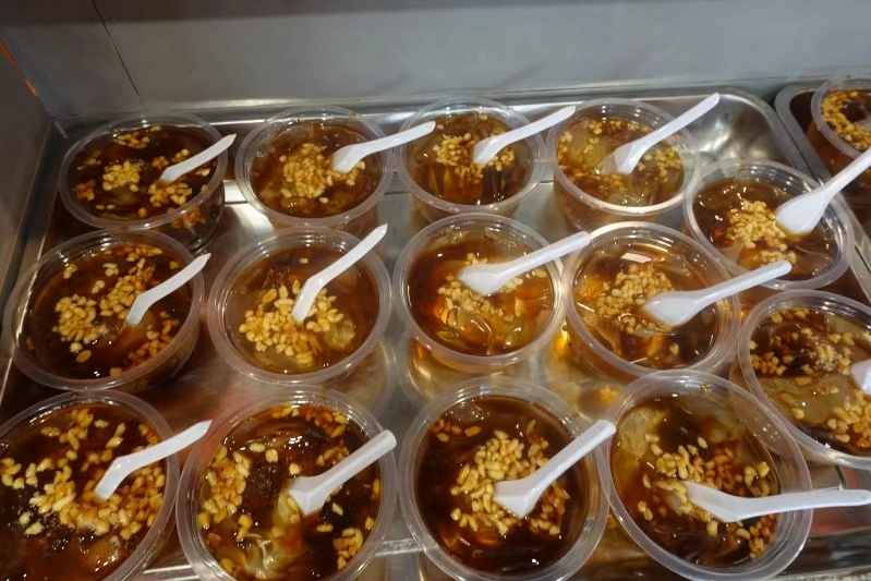 ? 冰粉晶瑩剔透,上面鋪滿了果仁,入口爽滑清涼,瞬間驅散了夏日的炎熱。蛋糕的造型精美,口感細膩,甜蜜的味道在舌尖上蔓延開來。當然少不了炒粉、炒面、水餃這些中式美食。